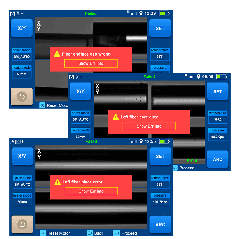 INNO fusion splicers continuously monitor the splicing process and clearly inform the user about the type of issue detected. Messages such as right fiber core shape wrong, left fiber place error, or fiber endface gap wrong provide immediate insight into what part of the process may need attention. This allows the user to analyse whether the issue is related to fibre placement, cleave quality, or preparation, rather than relying on trial and error.